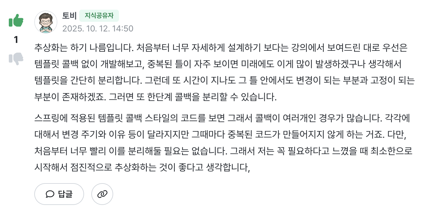 강의 속 예시를 보며 “URI 생성이나 예외 변환 같은 부분도 콜백으로 분리해야 하나?”라는 고민이 들었기 때문이다.