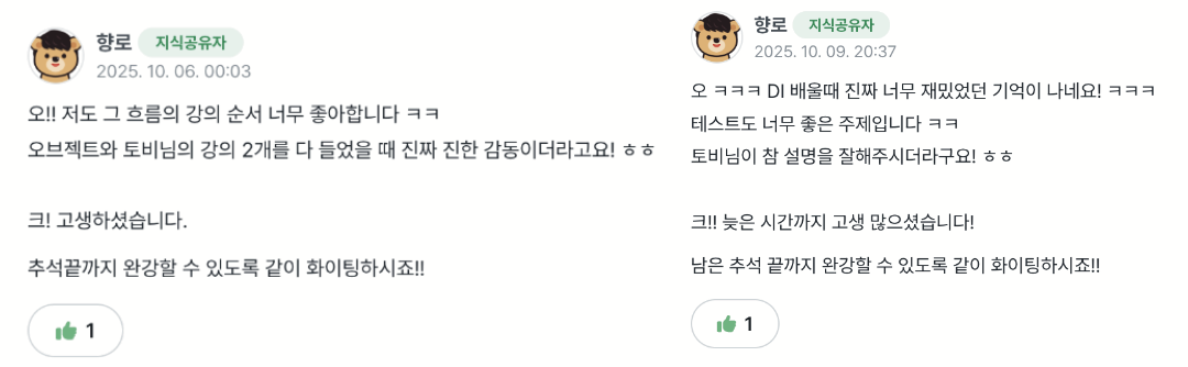 향로님께서 본인이 이해한게 맞는지 확인하는 질문, 모르는 용어 질문 등 누구보다 확실하게 답을 들을 수 있는 지식 공유자에게 하면은 도움이 될 것이다라고 해주셨고, 이 말을 보고 용기를 내어 강의 질문을 남겼다.