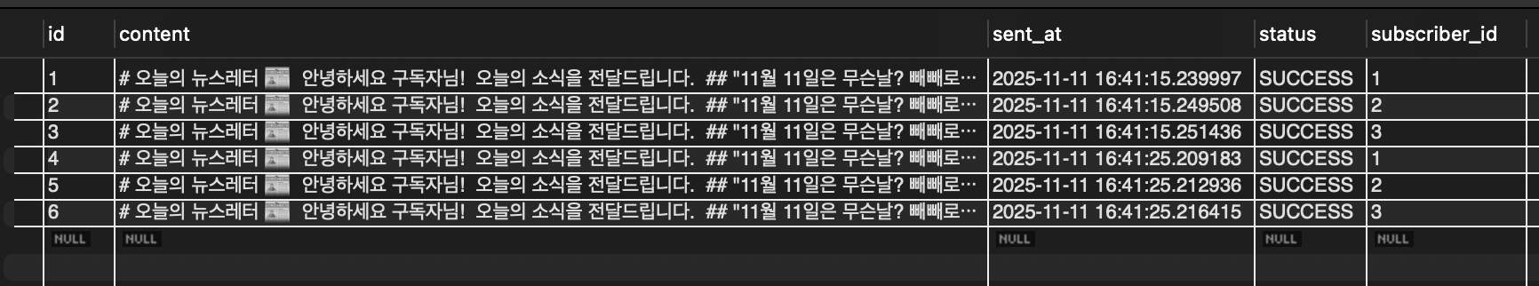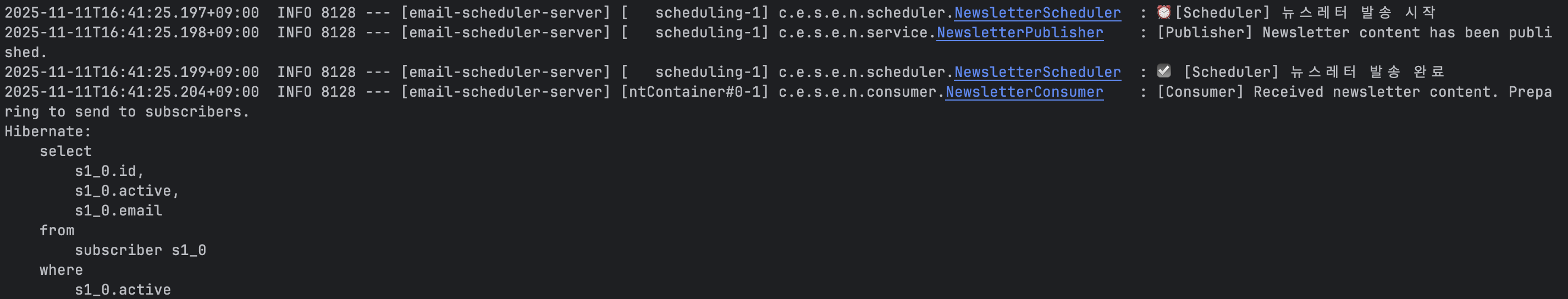 NewsletterScheduler: 10초마다 주기적으로 발행자(Publisher) 호출NewsletterPublisher: 뉴스레터 내용을 읽어RabbitMQ의 Fanout Exchange로 메시지 전송RabbitMQ: 발행된 메시지를 Queue에 안전하게 보관NewsletterConsumer: Queue에서 메시지를 수신Consumer: DB의 활성 구독자를 조회 ➔ 각 구독자에게 이메일 발송 ➔ 발송 성공/실패 결과를Message테이블에 기록